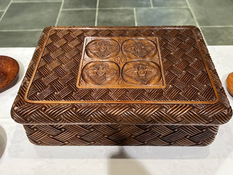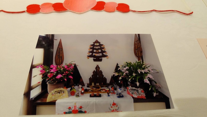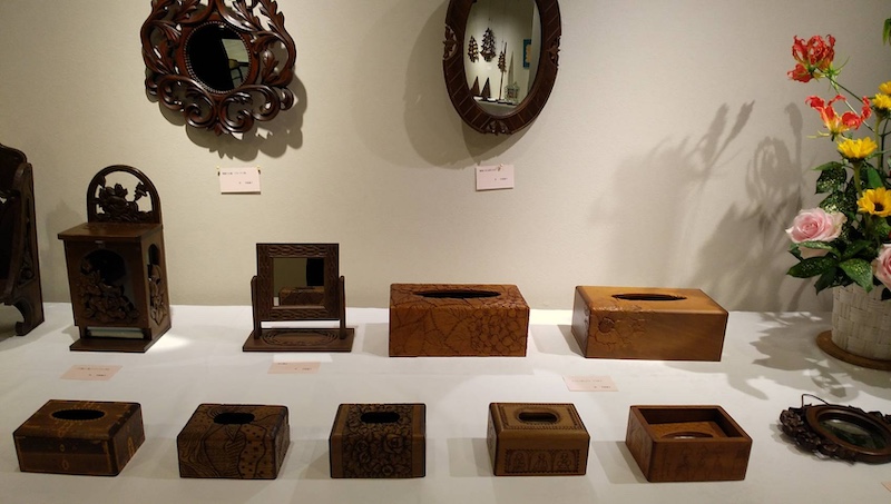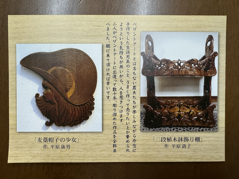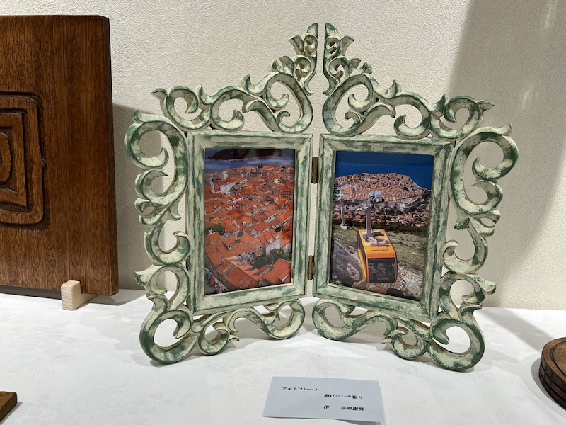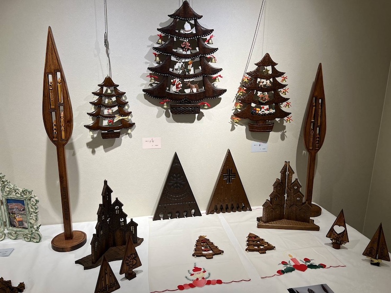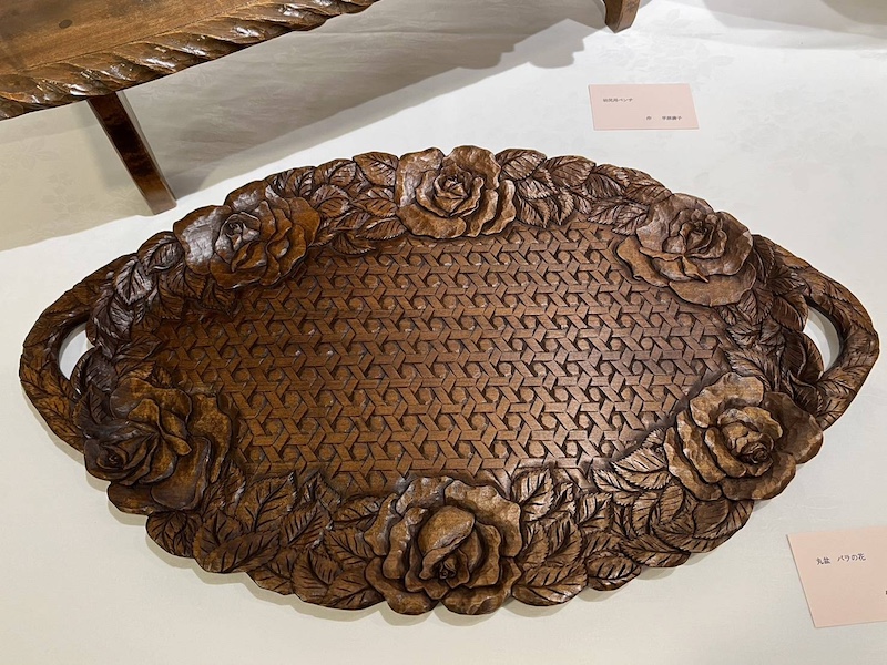 今は亡き、93歳まで教室に通ってくださったH・Aさんの息子さん御夫婦からペザントアート「木彫り夫婦展」の案内状を頂き、懐かしさと嬉しさで早速会場に向かいました。そこには御夫婦の丹精込めた数々の作品が会場いっぱいに展示されており、それらの作品の素晴らしさに目を奪われ、惚れ惚れと眺めてしまいました。(※画像クリックで拡大表示)
