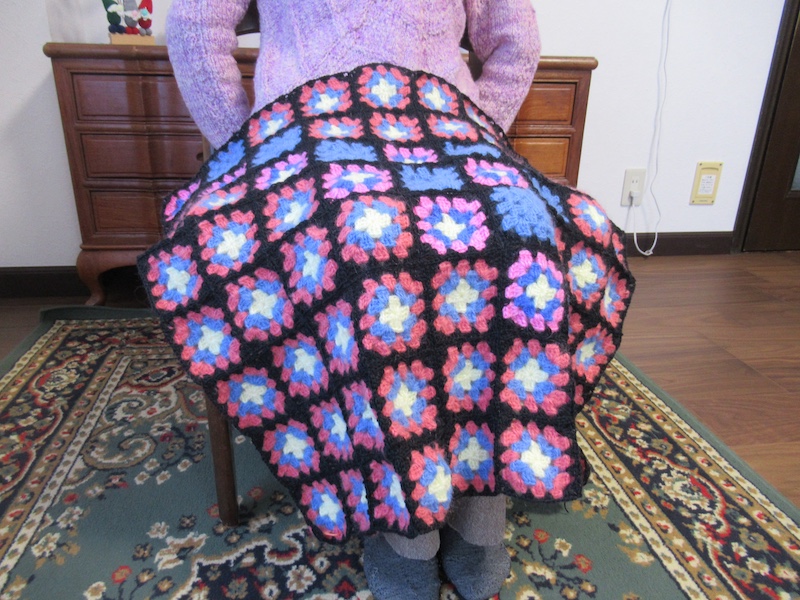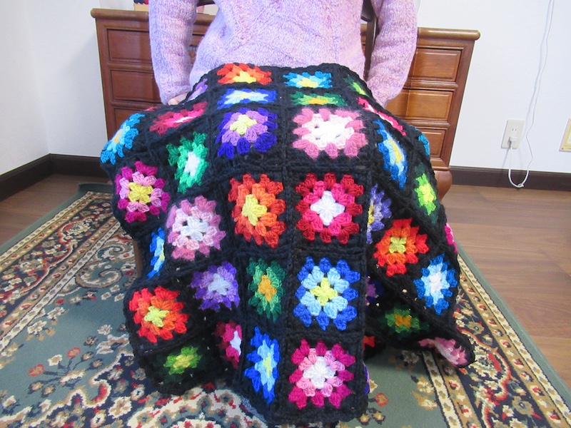 教室から帰る際に毛糸をどっさりと持ち帰って自宅でも編み続けてくれたようで、2回目の教室の際には編みかけのモチーフをたくさん持ってきてくれました!最終段は黒色にまとめることにして、出来上がりが楽しみだね〜!と言っていたのですが・・・なんと、月末にはひざ掛け2枚が完成、更には編みかけの作品も持ってきてくれました。想像以上の出来栄えの作品となり、感謝!感謝!大感激でした!
