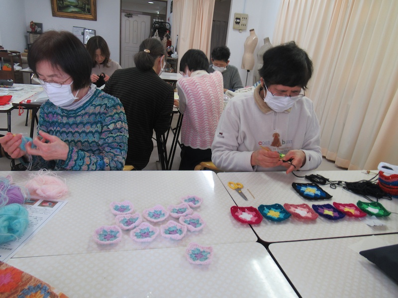 2月からスタートした新生ワンコインサロン。ボランティア作品を制作している3人の方は、早速チャリティバザー用の作品を編み始めました。たくさんの毛糸玉から自分好みの糸を選び、モチーフつなぎのひざ掛けを編んでくれています。みんなで共に「楽しい!」「配色の勉強になる!」「この作品を寄付したら喜んでもらえるかな?」「嬉しいね!」などどおしゃべりしながら楽しい時間を過ごしています。