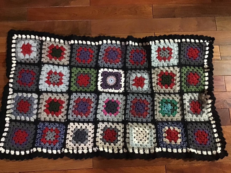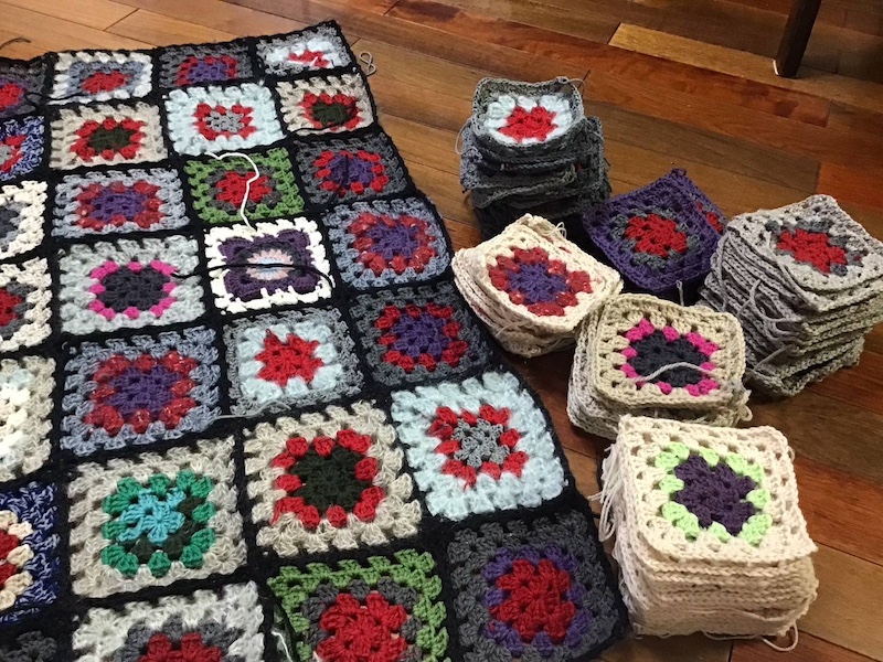 ワンコインボランティアクラスのひざ掛けは既に35枚以上完成していたのですが、金曜レース講座担当の高橋貞子先生から、ひざ掛け1枚とモチーフ83枚を寄付していただきました。「残糸を1枚のモチーフに作っておくと良いですね〜!勉強になりました」とのお言葉も。更には、他の講師や生徒さんたちもこの企画に参加・協力して頂けることになり、ボランティアの輪が大きく広がってきました。