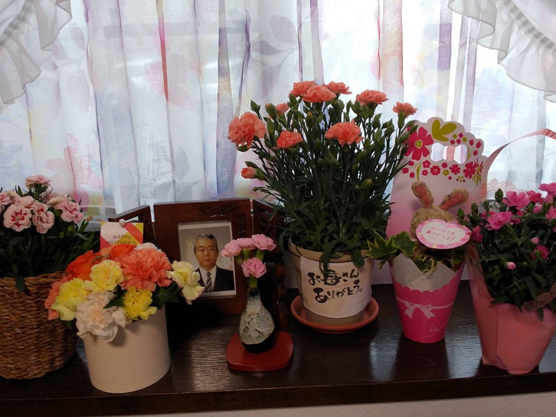 更に嬉しいことに、母の日には3人の子どもたちと仙台のYちゃんからカーネーションの花のプレゼントが届きました!早速、亡夫の写真の両側に並べて飾りました。