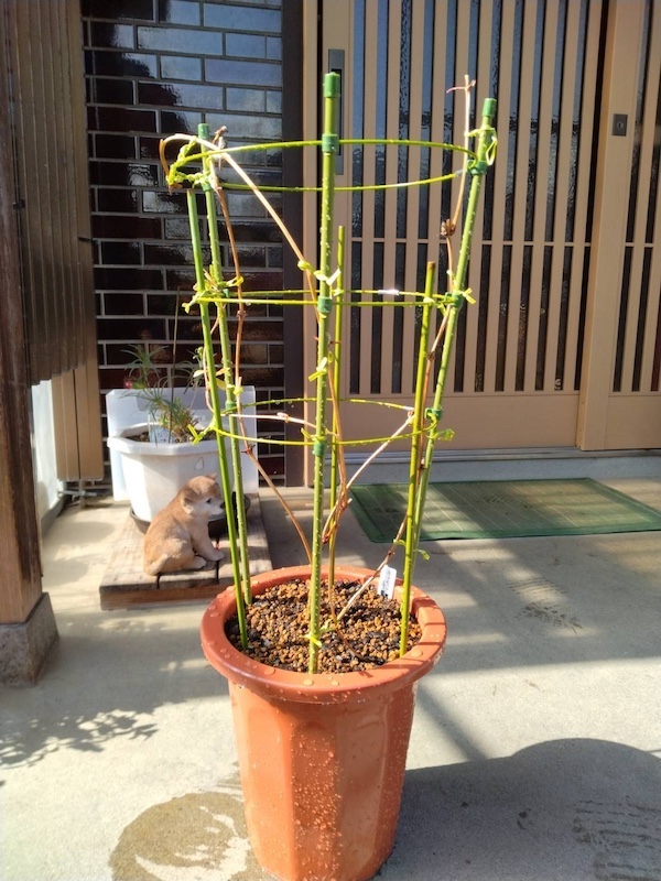 私の手入れが悪くて枯れる寸前になってしまったのですが、生徒さんのご主人が持ち帰って植え替えをしてくださったのです。そのおかげで今は大輪の花を咲かせてくれています。クレマチスの周りをアゲハ蝶が嬉しそうにひらひらと舞っている様子は、まるで亡夫が蝶に成り代わってお礼を言っているようにも思えました。