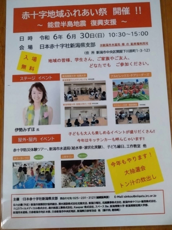日本赤十字社新潟県支部さんが主催するイベントが6月30日(日)に開催されます。令和6年能登半島地震災害の復興支援事業として、様々なブース出展やステージ企画、赤十字奉仕団による炊き出し、防災体験ツアー、無線・応急手当体験コーナーなどがあります。ご興味のある方は是非ご来場頂き、復興支援のための義援金募金にご協力頂けると幸いです。詳細は下記画像をご覧ください。