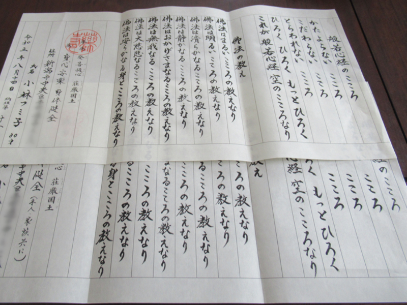 厳暑のお盆に墓参りを済ませ、先祖供養のために15年前から続けている写経を2巻完成させました。