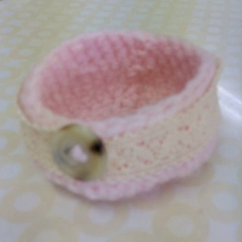学童保育の先生が子どもたちを集めて編み物を教えてくれたそうで、指編みの可愛らしい髪飾りを付けてきてくれました。かぎ針編みも練習中で、早速、写真の小物入れを完成させました。