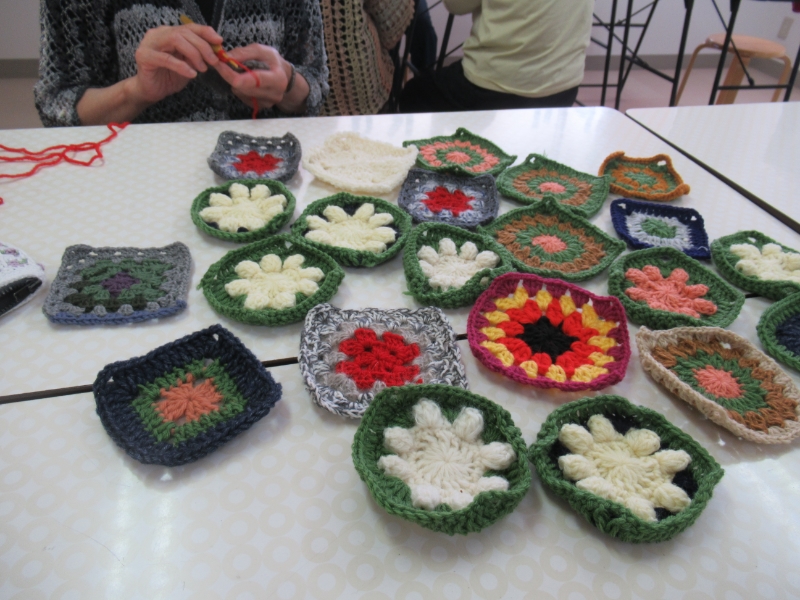 ボランティアクラスでは帽子・マフラー・ミトン・膝掛けなど被災者支援のための作品を編んでいます。