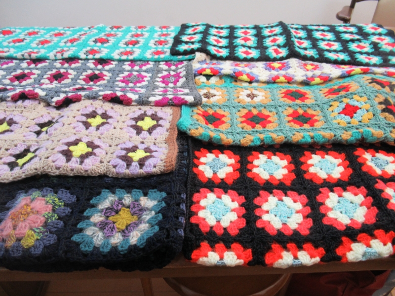 「帽子とかミトンでも編む?」「飽きないの?」と聞いても、「ひざ掛けが一番いいのよ!」「家でテレビを観ながら編めるし、よりどりの糸から配色の組み合わせを考えながら編むのが楽しいの〜!」との返事。