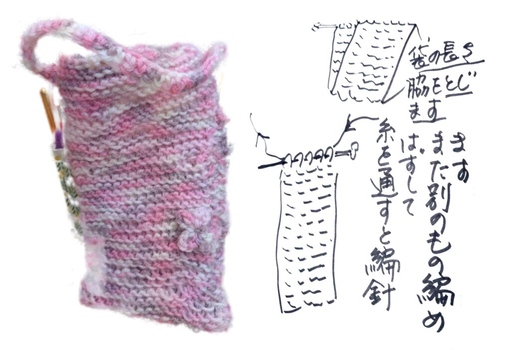 障がい者生活ステーションに通っている方と、棒針で編む時間を楽しんでいます。カルチャー教室や編み物教室へ自由に通えない方の所へ出かけていきます。ガーター編みのポシェットが完成した時は、手を取り合って歓声を上げました。ひと針づつ編んでいく努力の様子に学ぶことがたくさんあります。通所者の時間に合わせて月に1回ほど通っています。